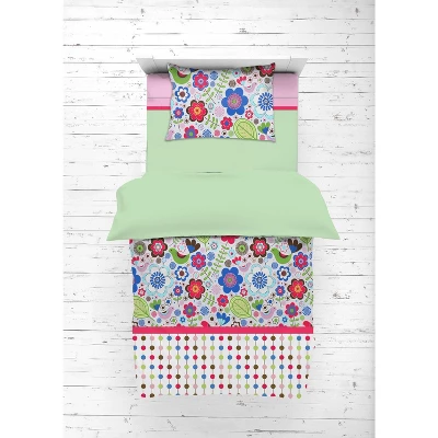 - This Bacati 4-piece Toddler Bedding Set Set Includes Reversible Oversize Comforter (42 x 55 inches), Toddler Bed Fitted Sheet(52 x 28 x 6 inches), Toddler Bed Flat Sheet(52 x 42 inches) which is fitted at the bottom to make the bed easily and Standard Pillow Case (20 x 25 inches) with french ties on the back in fun, colorful and signature prints in 100 percent cotton 200 Thread Count percale fabrics. Designed in United States by Experienced Designers. Many coordinating items available to purchase separately in this Bacati Botanical Floral Birds Pink Multicolor Bedding Collection.