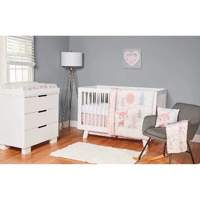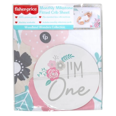 Woodland print cotton percale fitted crib sheet, comes with 6 double sided milestone cards to mark baby’s age. Fits 28×52 inch matresses.