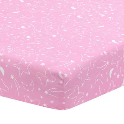 - Fitted crib sheet is on a pretty pink ground with white outlined shooting stars, moons, and bows