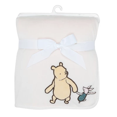 Cuddle your little one in this soft creamy white minky blanket. Disneyβs lovable Classic Pooh is appliqued with his forever friend Piglet. The back of this Winnie the Pooh blanket is a luxurious white faux shearling. Sized at 30β X 40β this stroller blanket makes a great baby shower gift and is a favorite baby registry item.