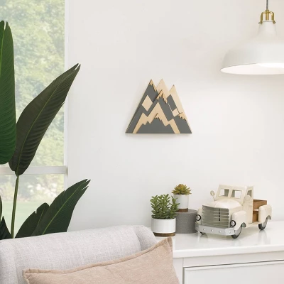 This Natural Wood 3D Mountain Wall DĂ©cor is sure to add fun to any nursery! This layered wood wall dĂ©cor features two metal hooks on the back for easy hanging! Features gray mountains with snow caps for a realistic look! Measures 9.5″ x 12″. Dust with a soft, dry cloth.