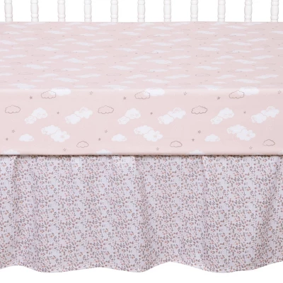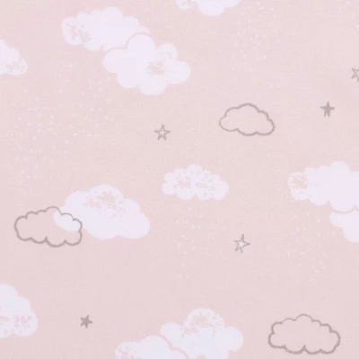 Fitted Crib Sheet fits standard crib mattress 28 in x 52 in with 8-inch deep pockets and is fully elasticized for a secure fit. Sheet features a cloud print on a soft pink background