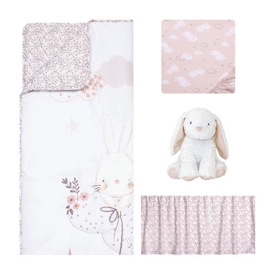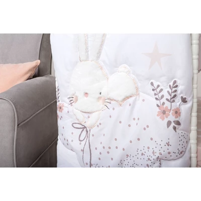 Let your little bunny drift off to sleep in a bed of clouds with the Cottontail Cloud collection by Sammy and Lou. An adorable bunny rests among the clouds and stars which are accented by floral and dot prints in a soft color palette of soft pinks and gray on a clean white background. The nursery quilt is a great 2-in-1 option and can be used as a blanket or a playmat for tummy time. Please adhere to JPMA’s Safe Infant Bedding Practices.