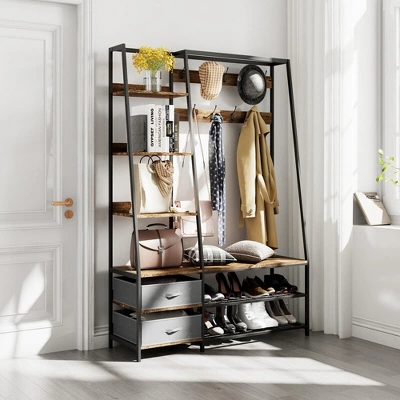 Are you looking for a versatile coat rack to well organize your stuff? Our multifunctional hall tree will be a perfect storage solution. It has 9 dual hooks,6-tier shelves,2 foldable dressers,1 shoe bench and 2-tier shoe rack,allowing you to hang or place your hats,bags,clothes,shoes and more. Besides,you can sit on the bench to conveniently change shoes or use it as an ordinary storage shelf. If you need more space to display your ornaments,you can easily remove the fabric dressers. Also,our coat rack is made of solid steel and engineered wood materials,which is strong and durable enough to serve you and your family for a long time.