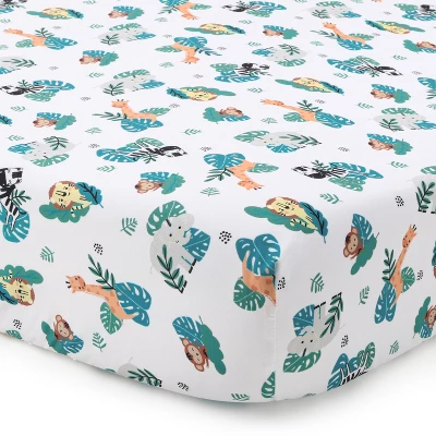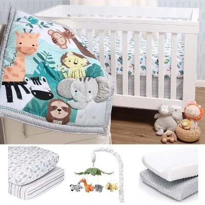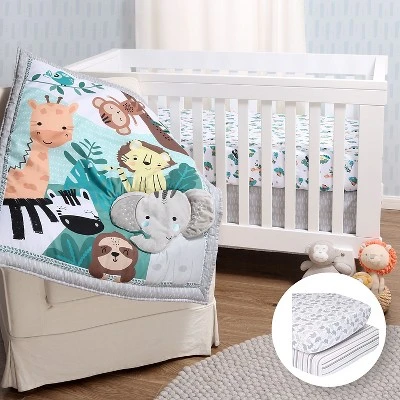 Bring all the jungle vibes right to your baby boy nursery with the 3-piece Wild Kingdom baby bedding set by the Peanutshell. Our colorful, multi-functional crib quilt features an elephant, lion, monkey, and more enchanting safari animals hanging out amid leafy scenery in various shades of blue and green. A tonal gray geometric border with printed leaf detail inside perfectly frames this adorable scene. The fitted crib sheet comes in a perfect universal fit, designed for a standard 28” x 52” crib mattress with snug fitting all around elastic. The crib sheet is a soft and stylish allover pattern of bright, colorful jungle animals and leaf clusters. The tonal gray geometric print bed skirt rounds out the look. Coordinate this set with our other jungle themed nursery décor, crib mobiles and sheet sets to complete your Wild Kingdom baby boy bedroom. Mom’s Choice Awards Honoring Excellence