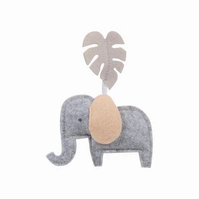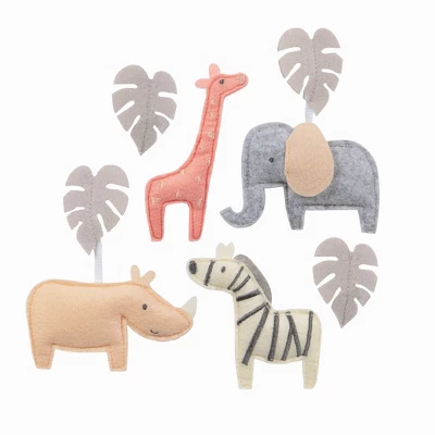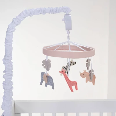 Encourage eye tracking and sound perception skills with this Sweet Jungle Musical Crib Mobile by Trend Lab. The 1-inch banded mobile ring features a sweet pink solid. A rhino, zebra, elephant, giraffe and tropical leaves are suspended from decorative white ribbon and slowly rotate to Brahms’ Lullaby. Crib Mobile fits standard crib rail up to 5 inches and measures approximately 24 in tall by 20 in wide when fully assembled.